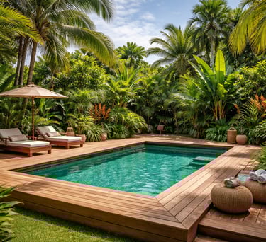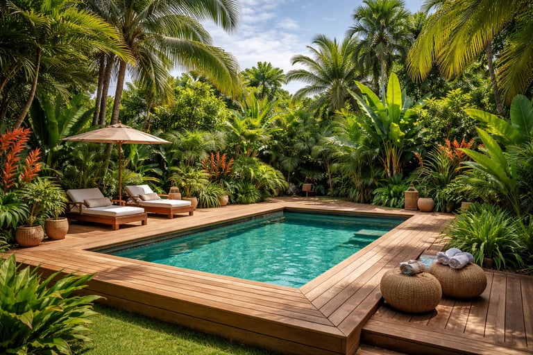Plages et contours : Antidérapants, résistants à l'eau chlorée, teintes naturelles.