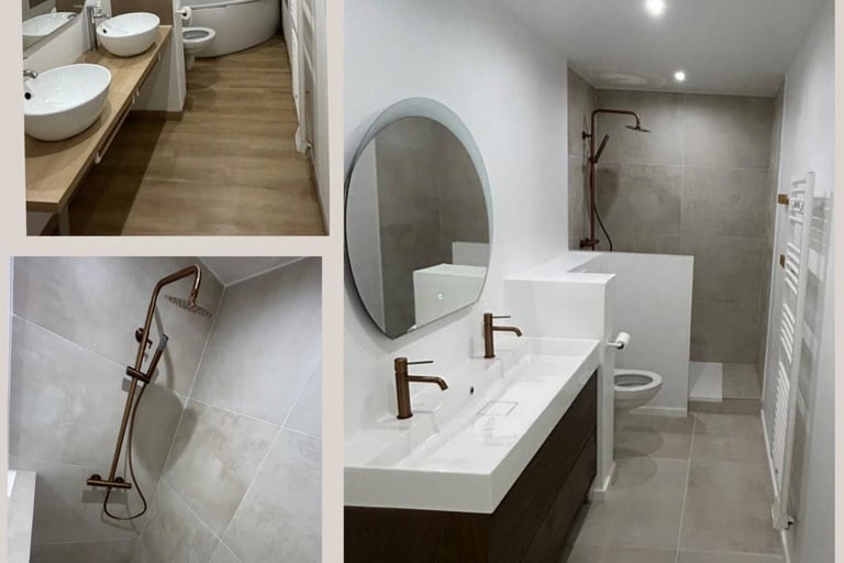 Transformation complète d'une salle de bain vieillissante en espace moderne et fonctionnel.